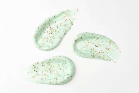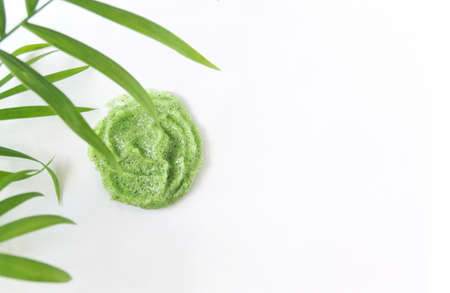 Gel texture with small particles of green scrub on a white background with green palm leaves. Skin cleansing cream and copy space.