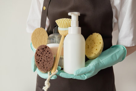 Person wearing gloves and apron holding natural sponges, bamboo brush, and soap bottles for cleaning