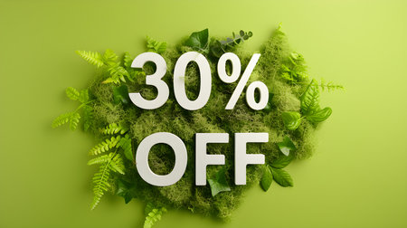 White '30% OFF' Promotional Sign on a Green Background with Copy Space