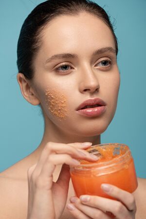 beautiful girl applying yellow sugar scrub from plastic container, isolated on blue