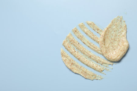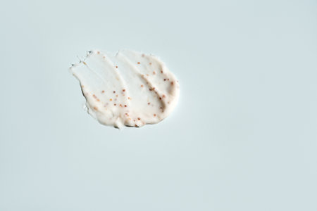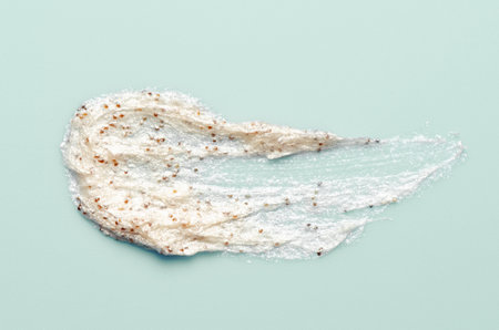 Macro shot showing smooth skin texture and swirled application of thick beige body scrub with brown exfoliating particles, highlighted by warm indoor lighting.