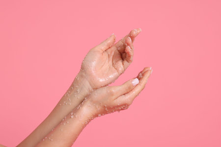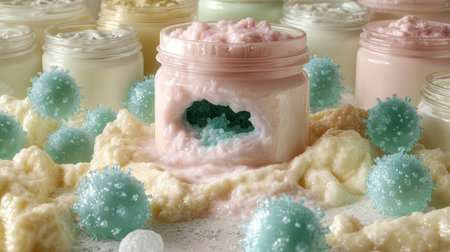 A glass jar filled with pink sugar scrub sits amidst a pile of sparkling crystals. The shimmering texture catches the light, creating a vibrant atmosphere perfect for self-care.