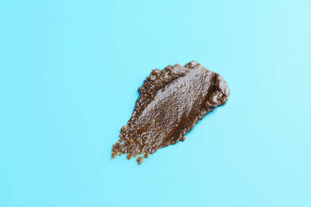 smiling young woman with coffee scrub on face, isolated on blue with leaf