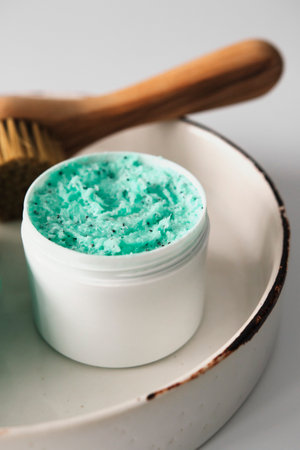 Scrub, soap and facial brush in a ceramic plate on a white table.