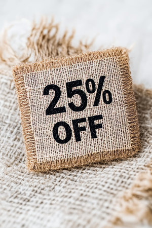 Rustic Square Discount Tag, 25 Percent Off Deal Banner on Natural Burlap Fabric Background