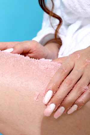Closeup woman legs with coffee massage scrub. Cosmetology, grooming, Spa cosmetic products, beauty and bikini concept.