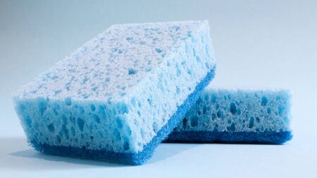 Two blue sponges used for washing and erasing dirt used by housewives in everyday life. They are made of porous material such as foam. Detergent retention, which allows you to spend it economically.