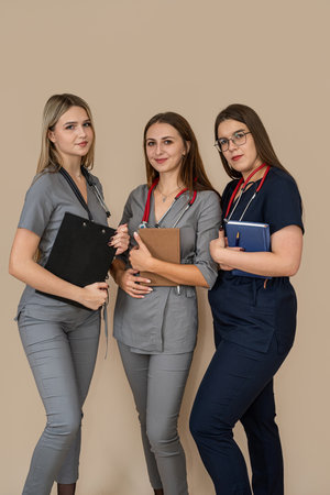 Three caucasian female doctor wearing coats with stethoscope isolated. Medical team worker
