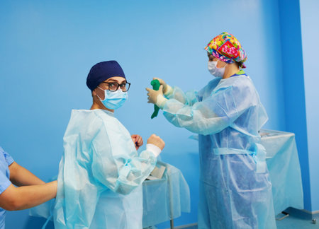 nurse helping Surgeon to wear gown at operation theatre for surgery - concept of professional occupation, expertise and supporting staff.