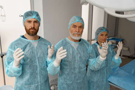Portrait of doctors wearing uniform and preparing to doing surgical operation at the theater of hospital. Medical Concept.