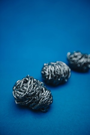 Keep your kitchen clean and fresh.Steel scrub sponges for pots and dishes on a bright blue one-color background. Close up. Blurred background.