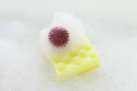 Yellow sponge and abstract coronavirus model in soapy foam. Healthcare concept. Hygiene during an epidemic.