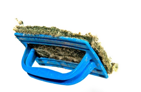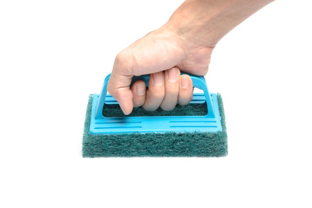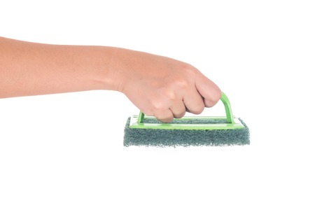 hand in a green rubber cleaning glove holds a plastic brush on a white background