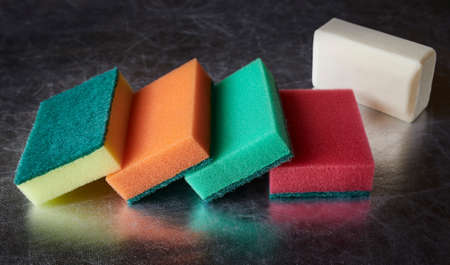 Yellow dishwashing sponges, cleaners, detergents, household cleaning sponge for cleaning, household cleaning sponge, Kuchenschwamm, Copy space