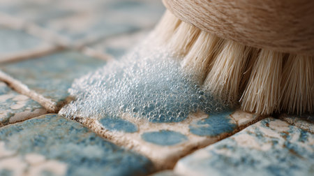 A close-up view of a brush scrubbing a textured blue tiled surface, with soap bubbles forming, capturing the essence of cleaning in the late afternoon light.