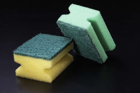 Sponge for washing dishes on a white background. Washcloth of green and yellow color. Two sponges are stacked on top of each other in macro. Yellow sponge on top