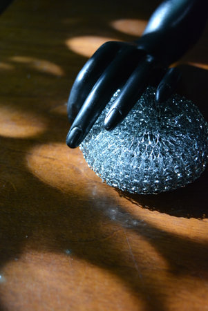 A closeup shot of a black hand holding a crystal ball on a wooden table. Black statuette of a matte female hand with metal sponge on brown wooden table of old style with sun rays.