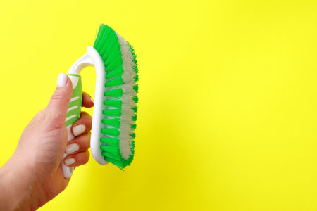 The housewife's hand holds a cleaning brush. Empty space for text or logo on a yellow background. Early spring or regular cleaning. Cleaning and cleaning concept.
