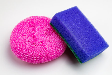 Pink and blue sponge is placed on a white surface. The pink sponge is positioned on the left side of the blue sponge