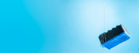 Kitchen dish washing sponge and dish washing liquid on blue background. Household cleaning scrub sponges with cleaning gel. Cleaning home concept. Copy space