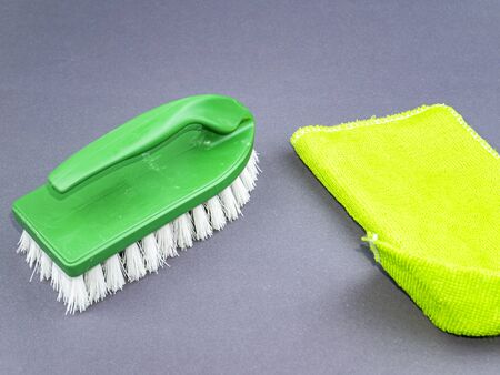cleaning products, blue sponge for hands with yellow rubber gloves.