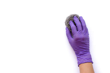 Closeup hand rubber glove holding steel wool ( scourer pad ) for cleaning scrub isolated on white background .