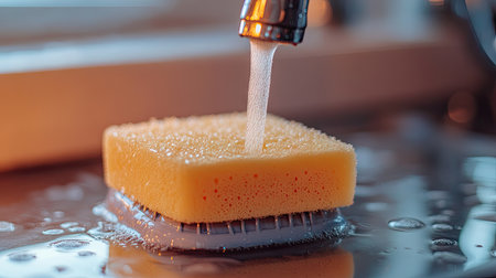 A dishwashing sponge in a small holder, placed near a faucet with water droplets reflecting light.