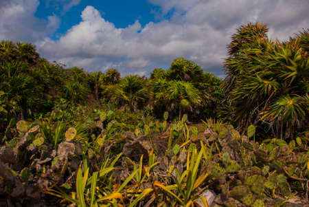 Beautiful tropical landscape with cacti and palm trees. Tulum, Mexico, Yucatan, Riviera Maya.