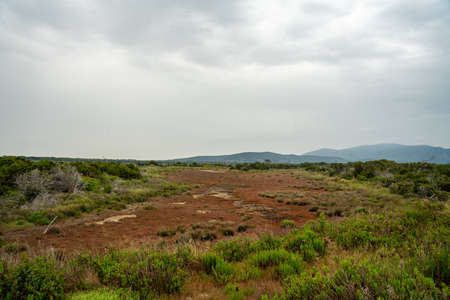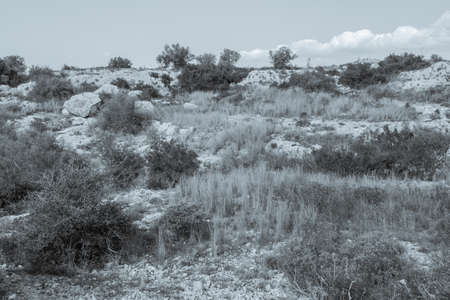 Rocky soil, overgrown with moss and shrubs. Mediterranean Sea coast. Subtropical plants of Cyprus.
