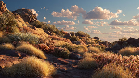 Desert Mountain Landscape with Golden Grass and Cloudy Sky