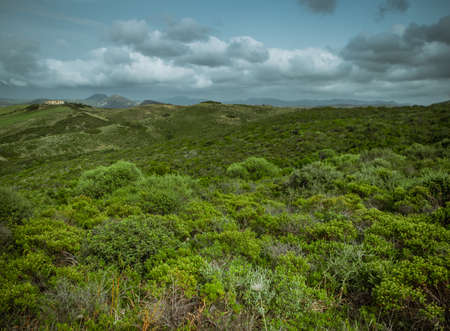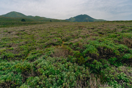 Montana de Oro State Park, California landscape. Native plants, green hills, and cloudy sky background