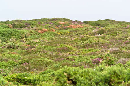 Scenic view of heather meadows on Cape Frehel, one of the most popular tourist destinations in Brittany, France. Widely known tourist attraction along famous GR34 tracking path