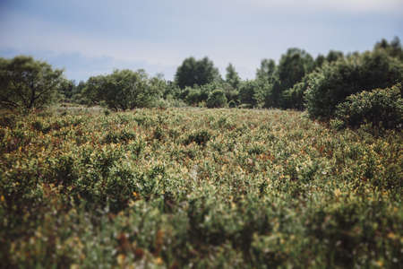 Green bushes in the forest, close-up. Dense thickets of living plants in wild. Picturesque greenery, foreground in focus. Nature background