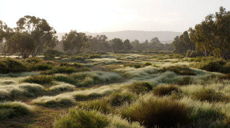 Bright green foliage covers rolling hills, showcasing an array of plants thriving under the warm sun. The landscape radiates life and tranquility, inviting exploration and connection with nature.