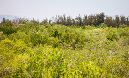 Aerial view of landscape pattern of trees growing on tidal salt flats.