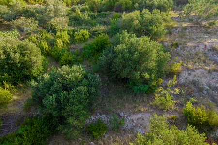 Top view on the bushes and trees in summer. Aerial photography of the landscape.