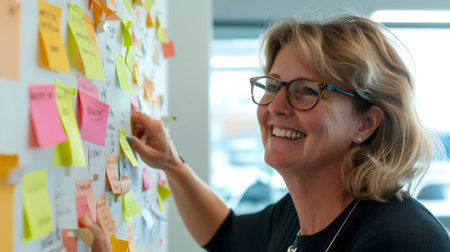 Professional woman efficiently manages tasks using colorful sticky notes on a board, embodying multitasking and time management in a busy work environment