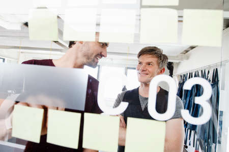 Rear view of a man looking at sticky notes on wall in office