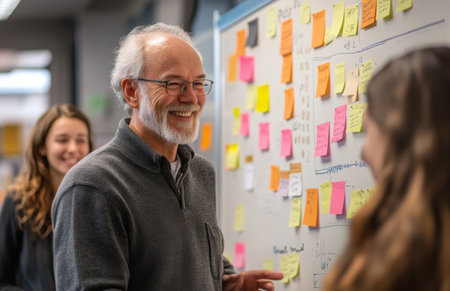 Dedicated business consultant leads a productive team meeting with a vibrant planning board in the background