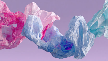 Floating, crinkled, colorful papers against a purple background, creating a dynamic flow