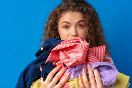 Pile of various colorful clothes, fast fashion waste concept. Mixed garments heap for textile recycling design
