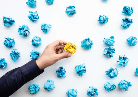 Idea and creativity concepts with person choosing outstanding paper crumpled ball in mountain shap.Think out of box.Business solution.
