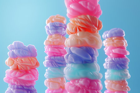 A stack of colorful, multi-colored, and oddly shaped objects. The objects are piled on top of each other, creating a visually interesting and playful scene with Generative AI