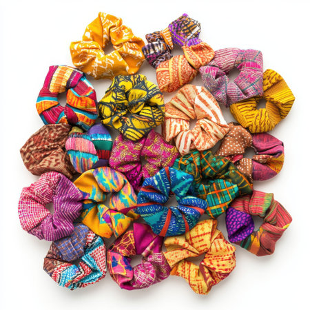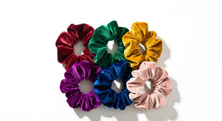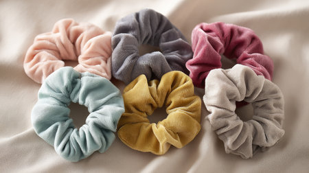 Colorful assortment of hair scrunchies on a white background. Concept of beauty accessories, fashion haircare, personal styling.