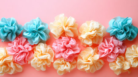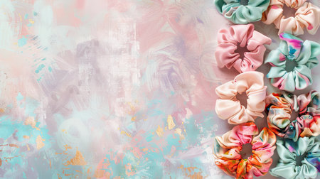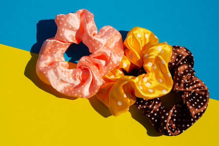 Collection of colorful scrunchies on pastel artistic background. Concept of hair accessories, feminine fashion, artistic design. Copy space.