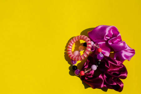 Lilac and purple hair ties and a bracelet lie on a yellow background. Horizontal photo with hard lighting