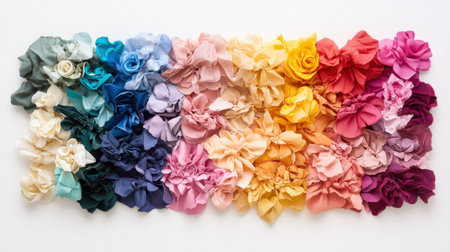 A stunning layout of fabric flowers in a vibrant spectrum of colors, offering a creative touch for home decor and artistic projects. Ideal for craft enthusiasts!