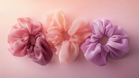 Pastel Colored Scrunchies on a Glossy Surface. Concept of hair accessories, personal care, fashion style. Copy space.