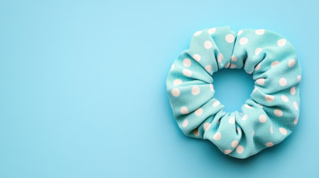 This image features a light blue polka dot hair scrunchie on a solid blue background, ideal for fashion, beauty, and lifestyle projects.