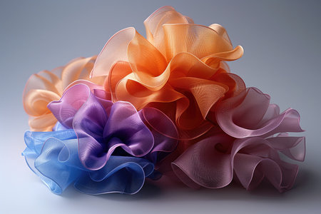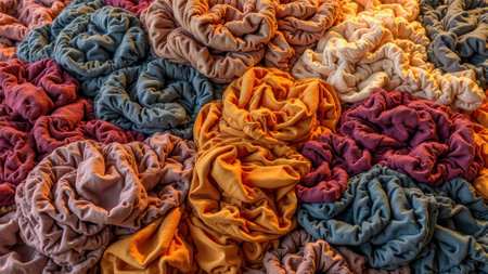 Vibrant assortment of multicolored fabric scrunchies in various textures and shades. That the image is generated using AI.